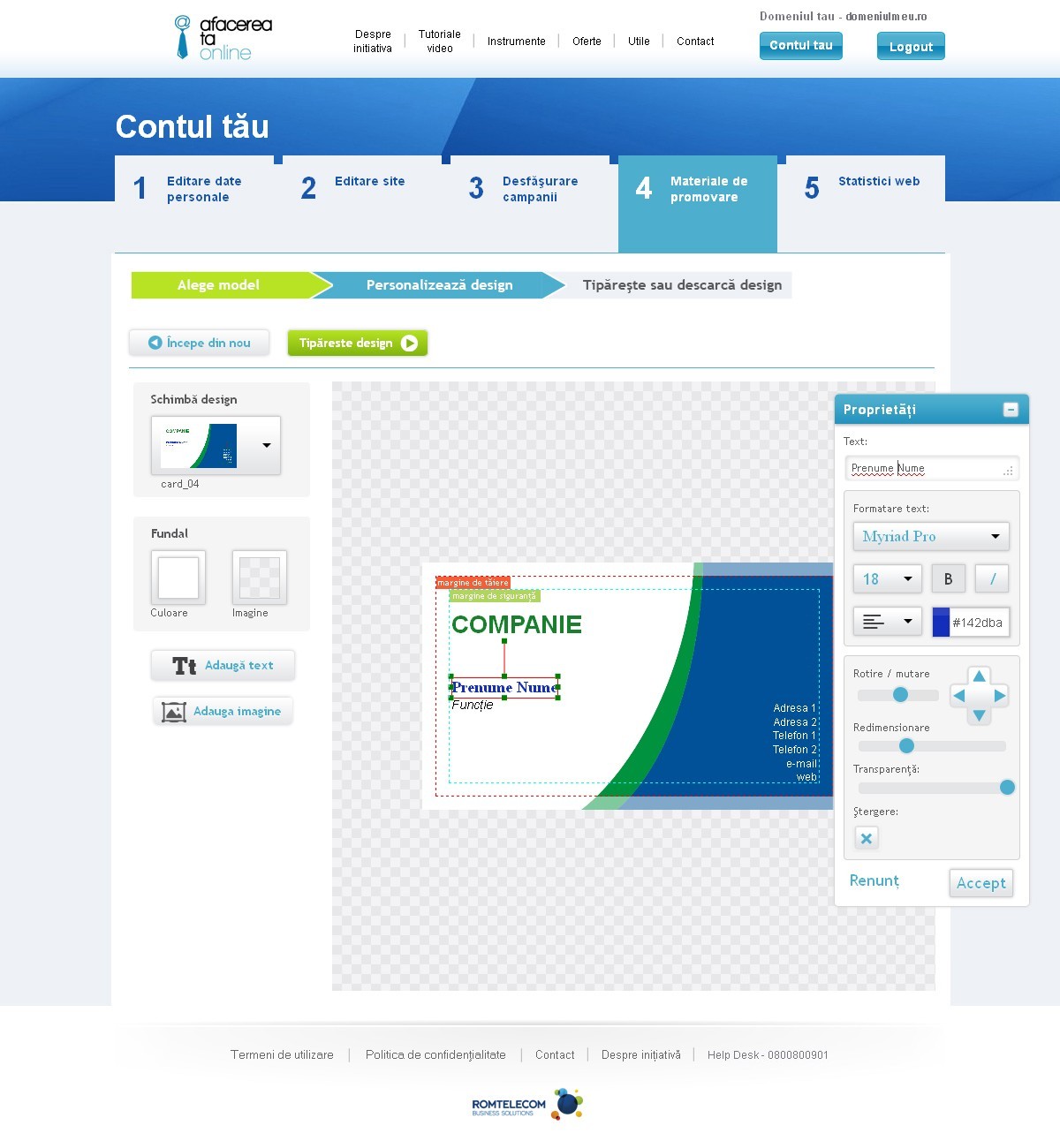 Secţiunea “Materiale de promovare” din cadrul platformei afacereataonline.ro a fost dezvoltată cu sprijinul Agrafa Print, furnizor selectat pe baza experienţei dobândite prin realizarea şi susţinerea primului site românesc de tip web-to-print, pucu.ro, care foloseşte conceptul do-it-yourself pentru realizarea cărţilor de vizită. Prin accesarea secţiunii de „Materiale de promovare”, utilizatorii au la dispoziţie o aplicaţie online simplă şi intuitivă care le oferă posibilitatea creării şi personalizării cărţilor de vizită şi a posterelor, fie de la zero, fie prin selectarea unor modele predefinite şi modificarea sau adăugarea de imagini şi texte proprii. După realizarea materialelor, acestea pot fi descărcate în fomat ready-to-print sau pot fi tipărite chiar la Agrafa Print, în condiţii de calitate ridicată şi la preţuri promoţionale.