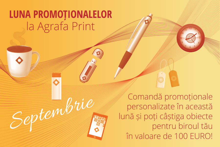 Și pentru că ne place să ne bucurăm clienții, luna septembrie vine și cu surprize pentru cei care comandă obiecte promoționale personalizate. Coamadă și tu obiecte promoționale personalizate și poți câștiga obiecte pentru biroul tău în valoare de 100 de euro. Punem în joc trei astfel de premii în această lună pentru orice comandă de obiecte promoționale.